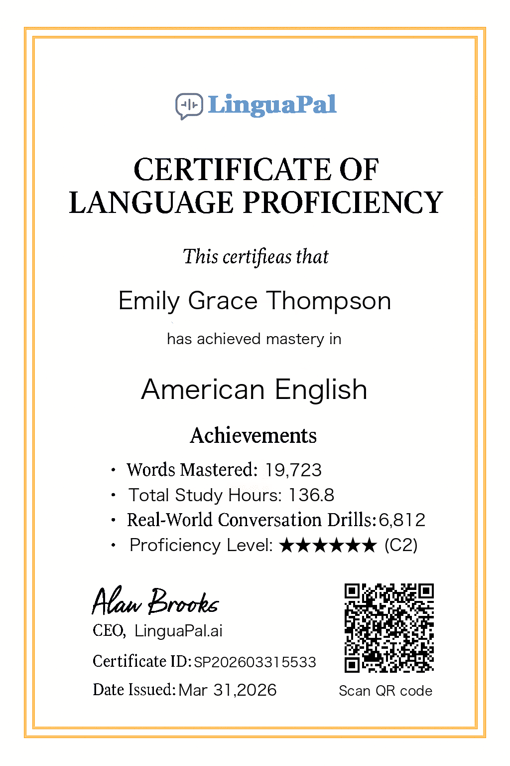 Deltag i LinguaPal.ai, tal med din AI-engelsktalende partner, og lad platformen generere et sprogcertifikat, der afspejler dine reelle engelskkundskaber — ikke kun testtricks.